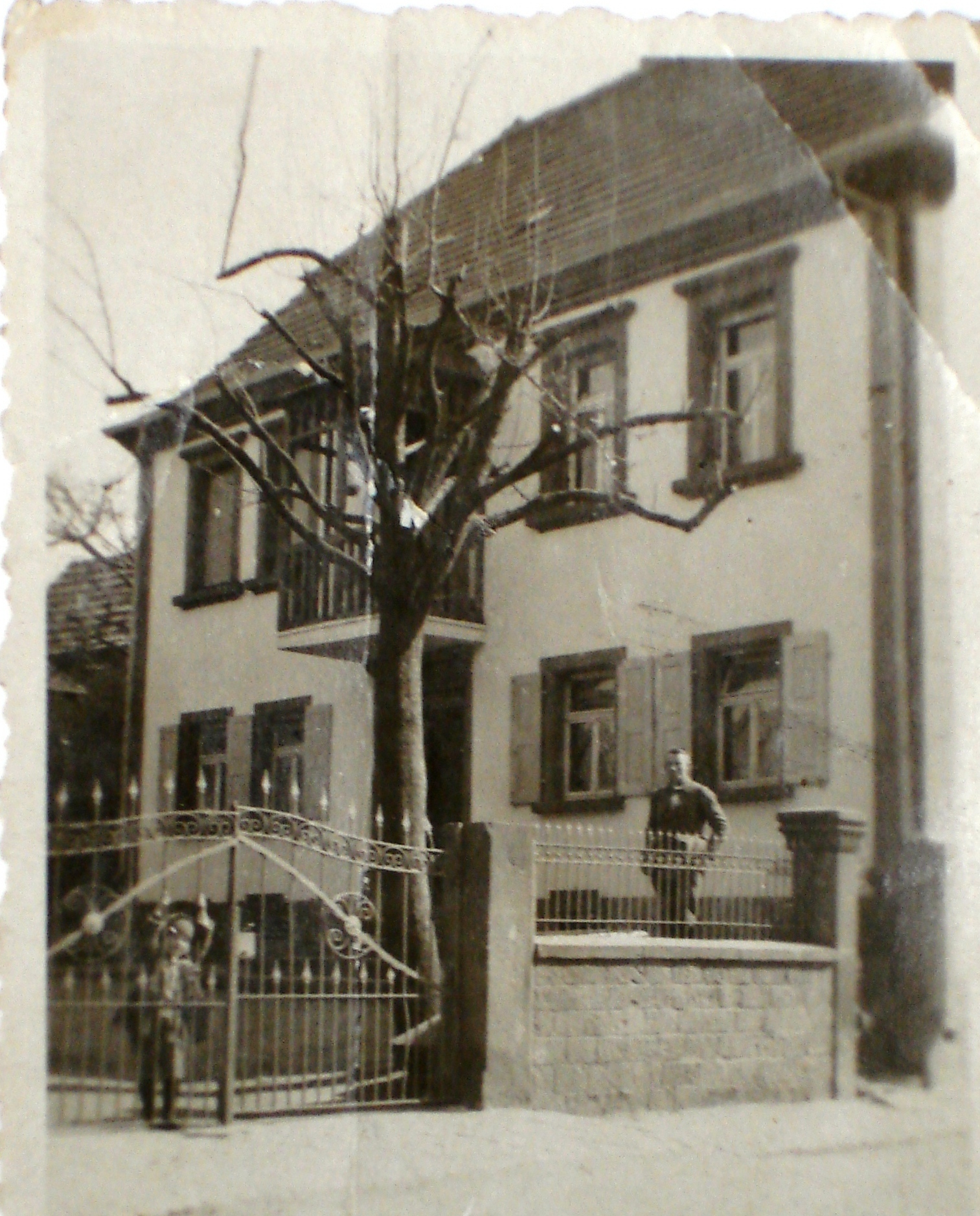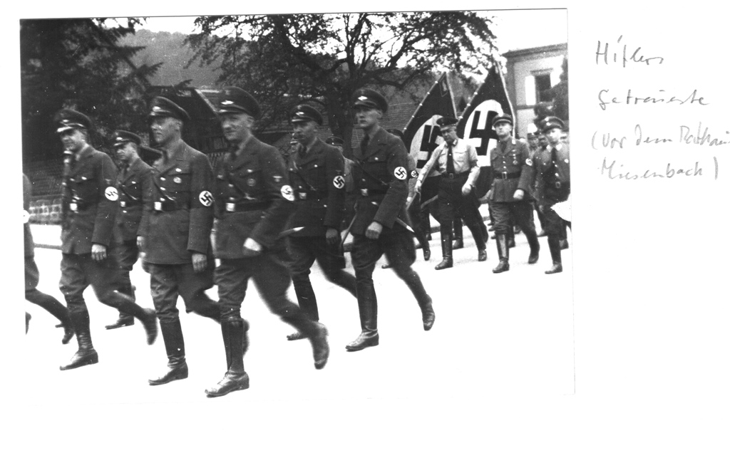 NSDAP Hauptquatier, Kreisleiter war der Vater von Gretel Kleemann, die im Ortsbuch berichtete, dass nach dem schweren Bombenangriff auf Miesenbach starke Schäden zurückblieben. Nur die Wand mit dem NSDAP-Logo blieb stehen.